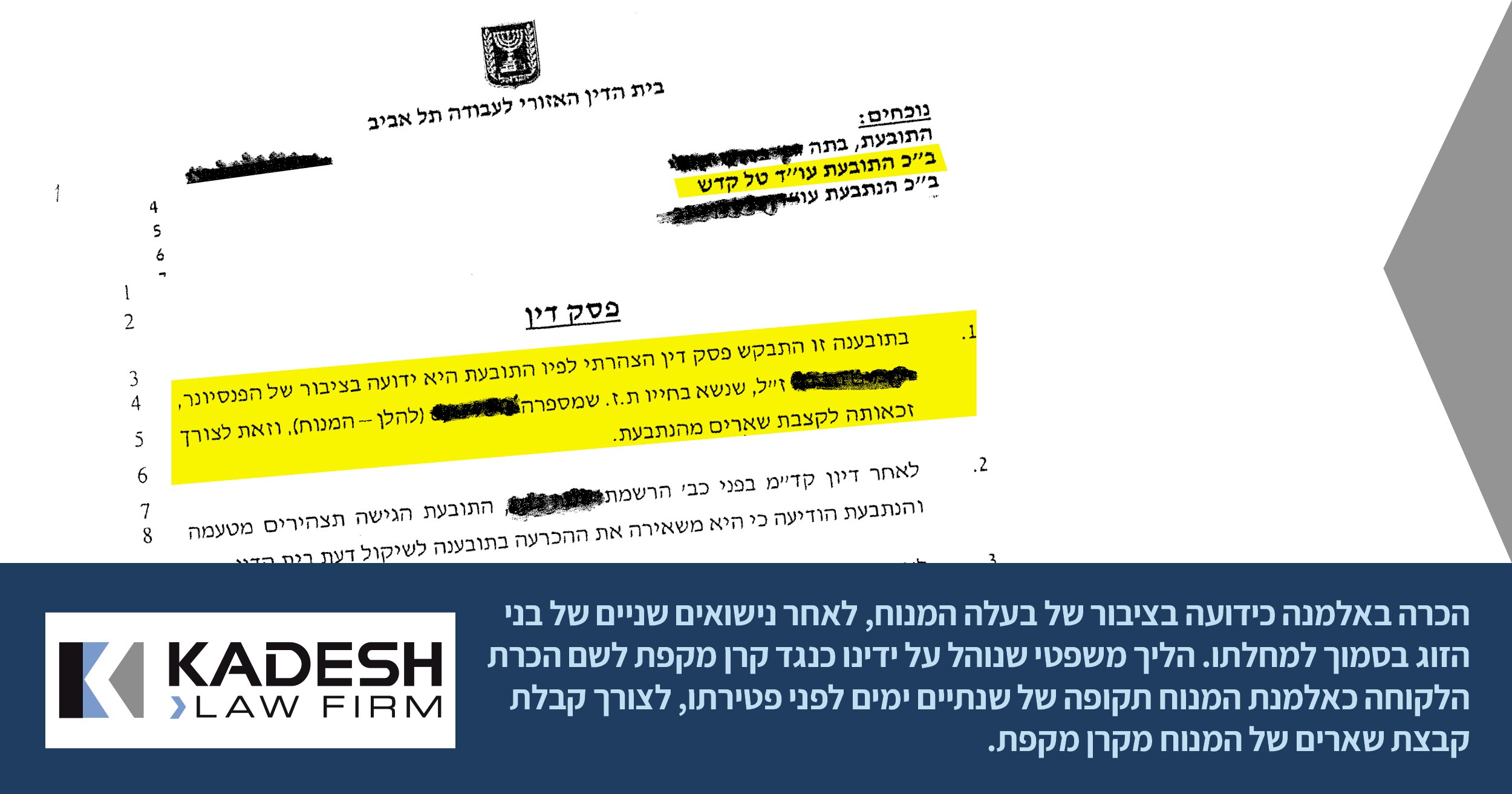 הכרה באלמנה כידועה בציבור של בעלה המנוח, לאחר נישואים שניים של בני הזוג בסמוך למחלתו. הליך משפטי שנוהל על ידינו כנגד קרן מקפת לשם הכרת הלקוחה כאלמנת המנוח תקופה של שנתיים ימים לפני פטירתו, לצורך קבלת קצבת שארים של המנוח מקרן מקפת.