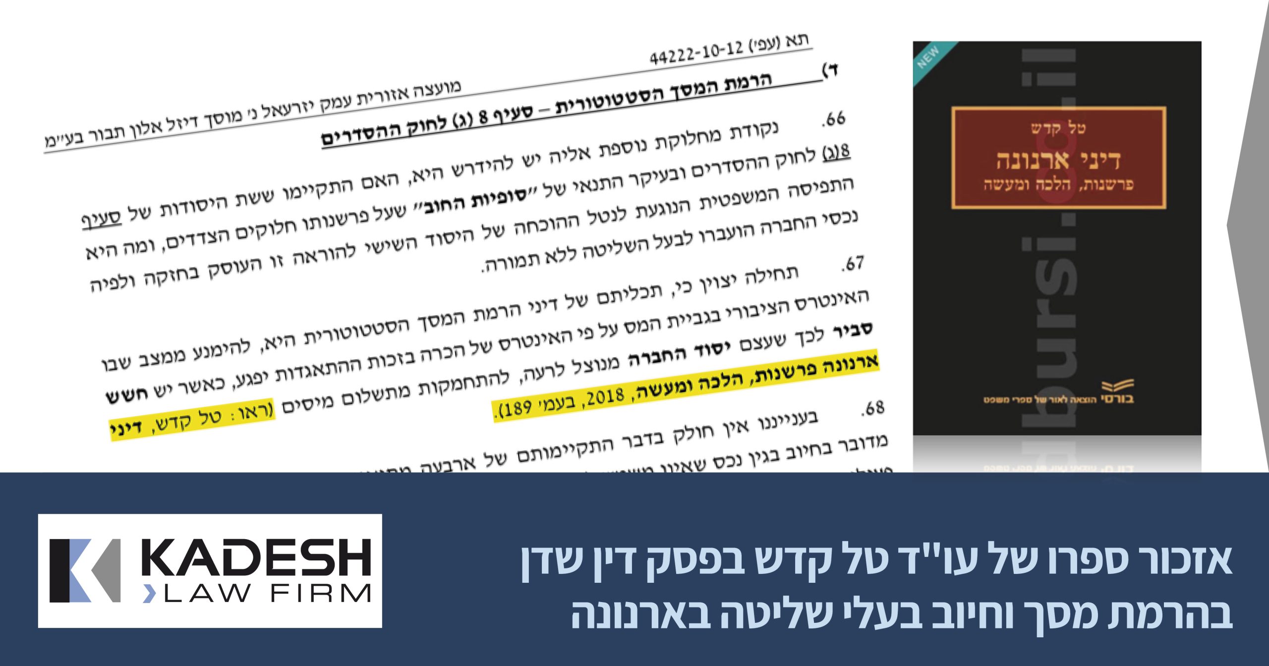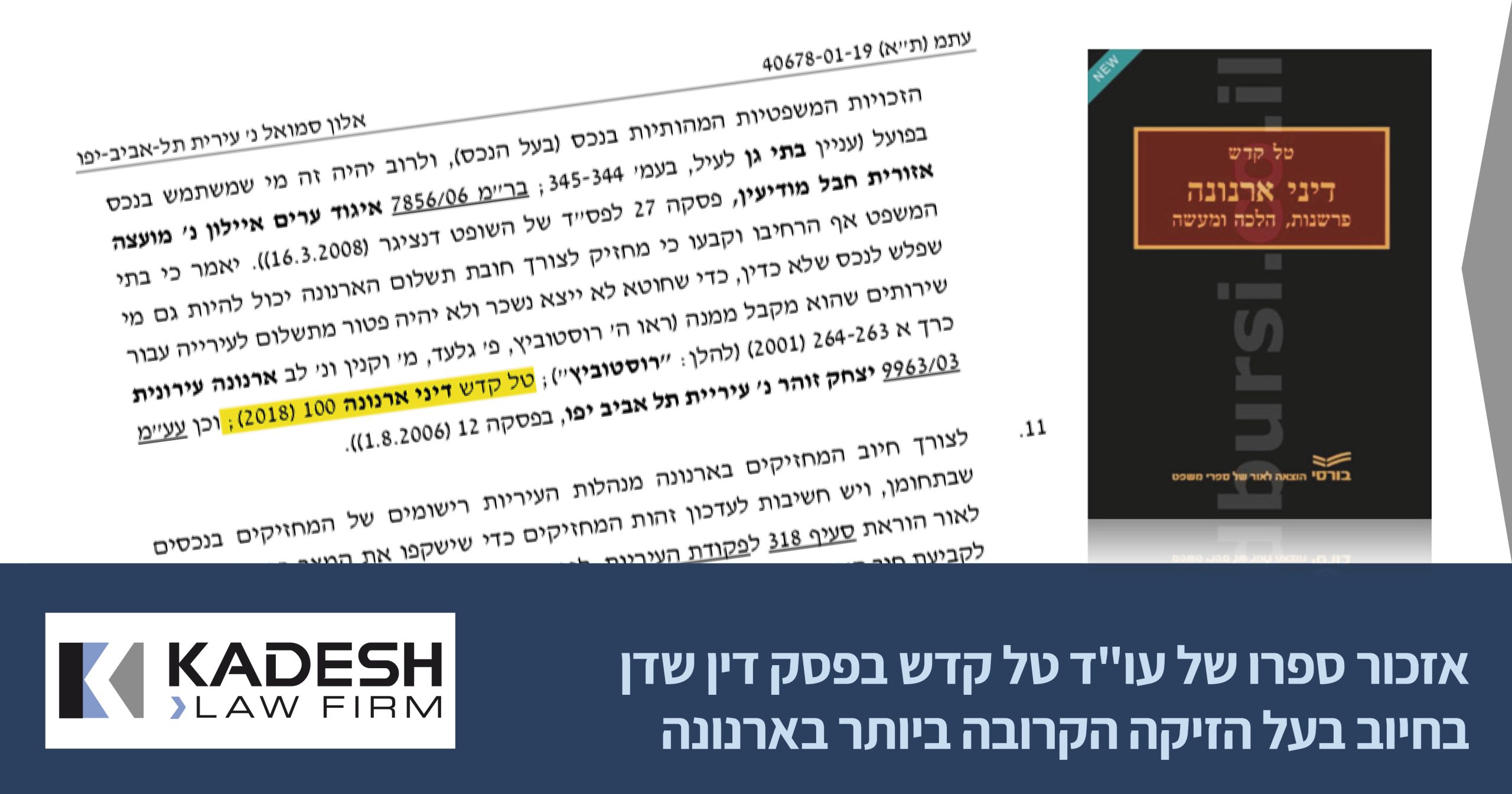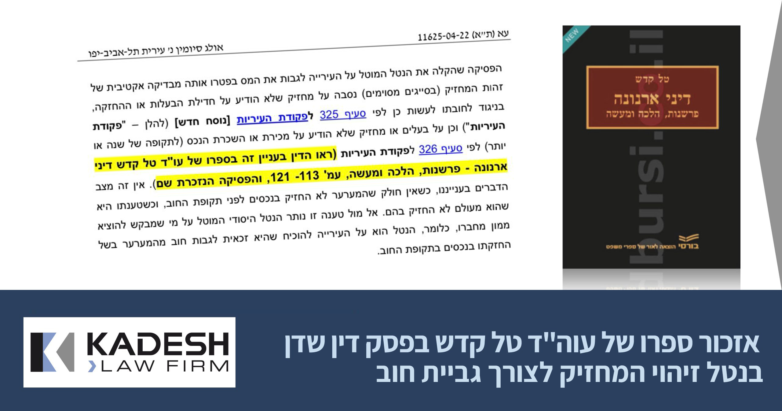 הספר "דיני ארנונה – פרשנות הלכה ומעשה" פרי עטו של עו"ד ונוטריון טל קדש יצא לאור בשנת 2018.